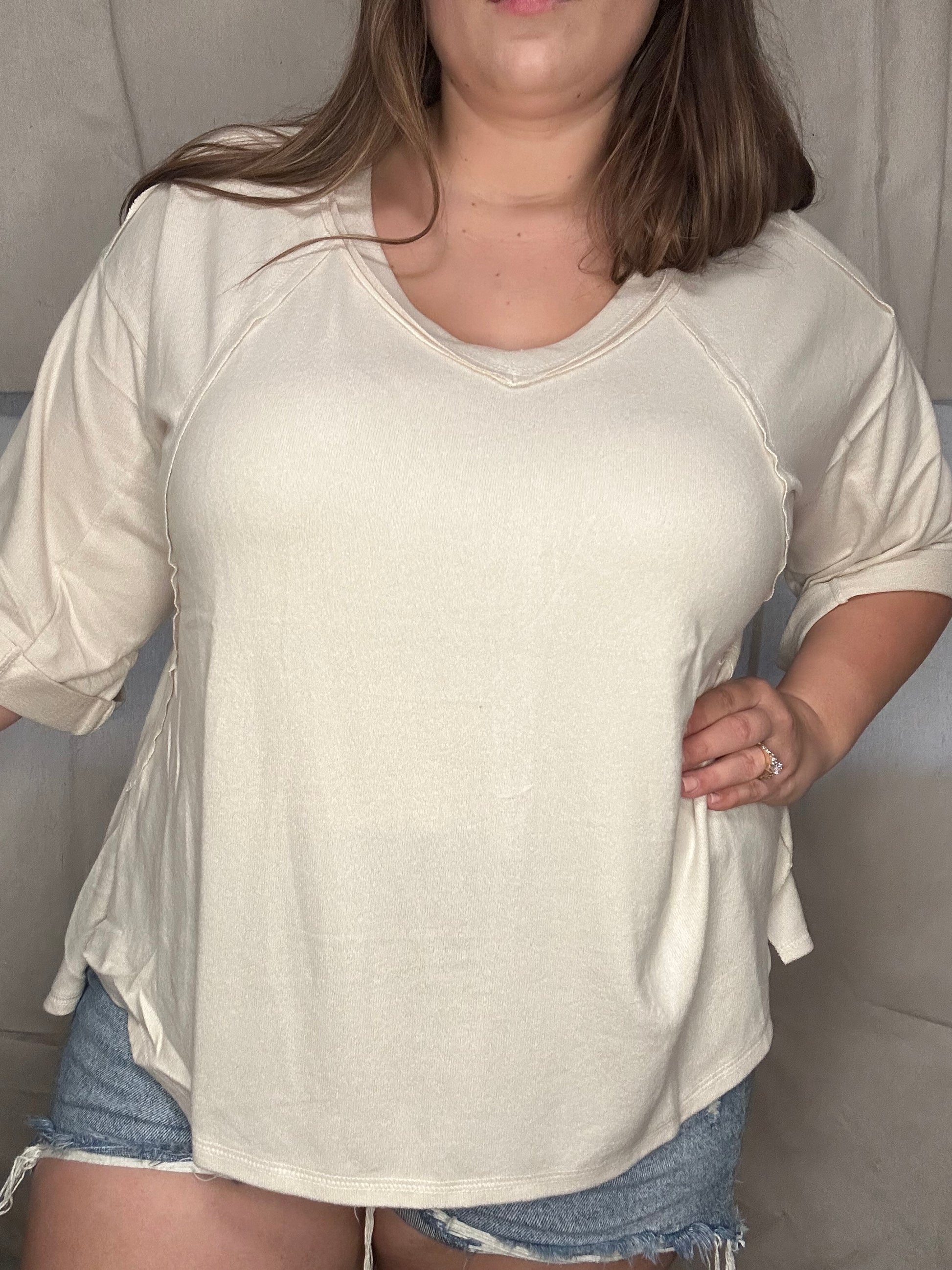 Plus soft melange exposed seam v-neck 3/4 slv hi low top